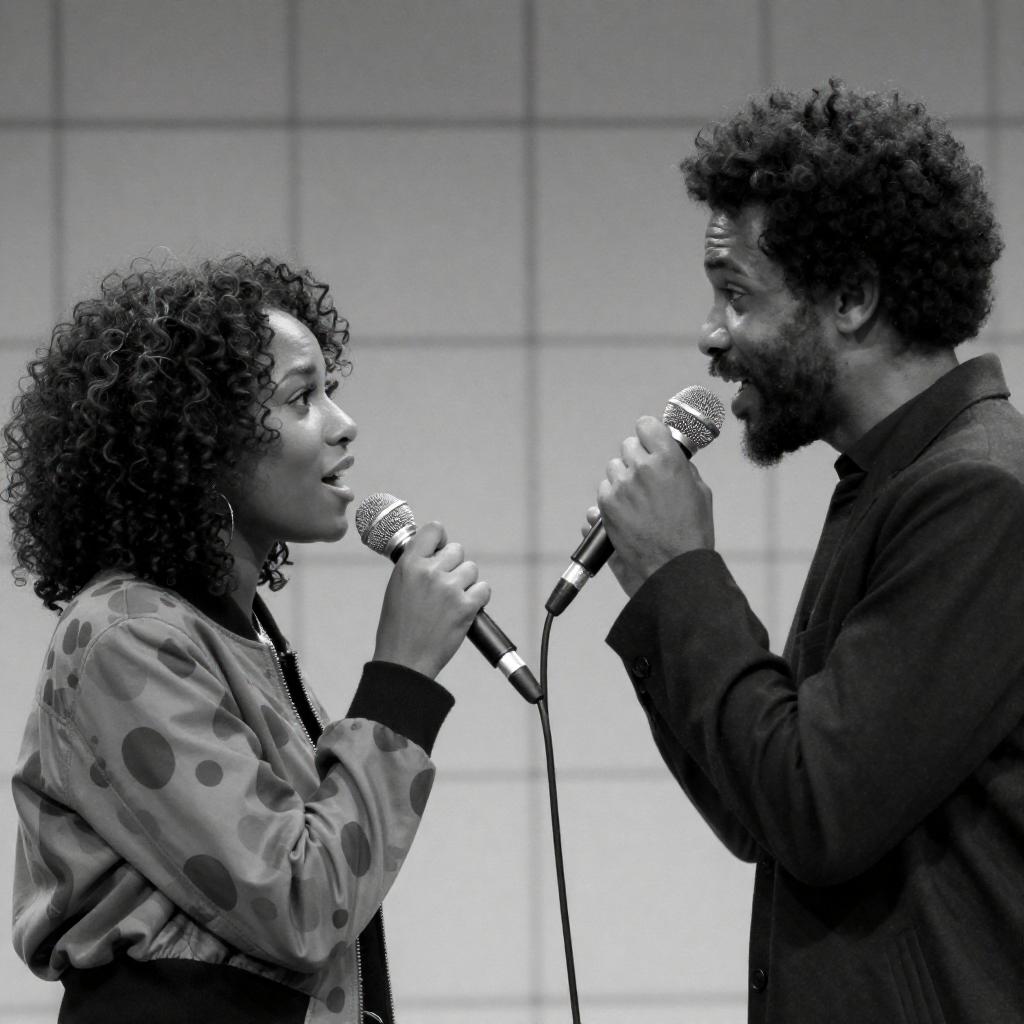 Black-and-white photograph of a man with an afro and a woman with curly hair, wearing a patterned jacket, singing into microphones. The man is on the right, the woman on the left, both facing each other. The background has a ured, grid-like pattern. The woman's jacket has large, dark spots.