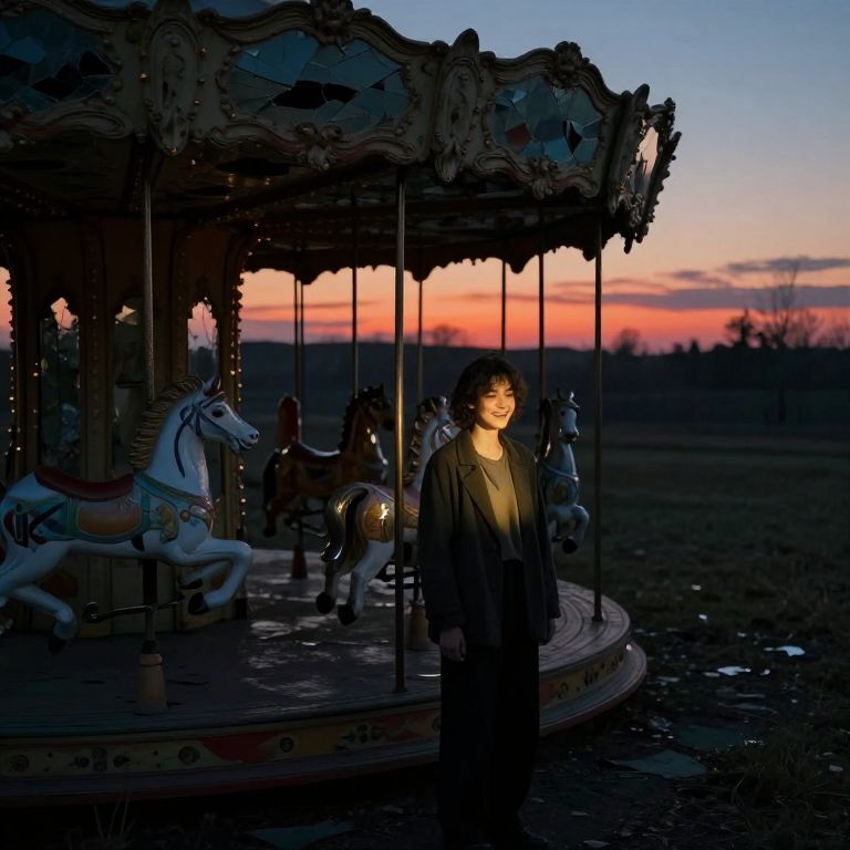 A haunting portrait reminiscent of Edward Hopper's evocative works depicts a solitary figure standing near an abandoned carousel as vibrant sunset hues bleed through its fractured mirror at dusk. The subject, bathed in the eerie glow of a spotlight, wears a mysterious smile that suggests both sorrow and hope. From a high vantage point, the camera captures the surreal atmosphere of desolation and nostalgia, inviting viewers to contemplate the untold stories hidden within this timeless scene.