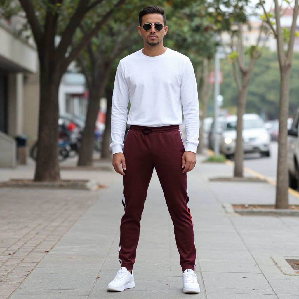 Photograph of a young man standing on a city sidewalk. He has a medium build, short black hair, and light brown skin, wearing round sunglasses, a white long-sleeve shirt, and maroon track pants with white stripes on the sides. He completes the outfit with white sneakers. The background shows a tree-lined street with parked cars and blurred city buildings, suggesting an urban setting. The sidewalk is paved with rectangular stone tiles, and the trees have green leaves. The overall style is casual and modern.