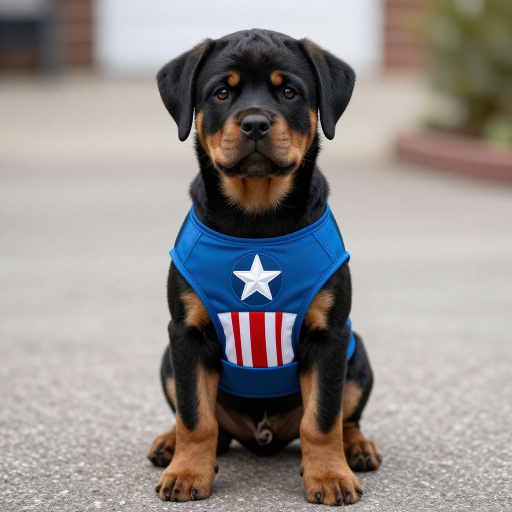 Bauhaus Rottweiler Puppy wearing captain america costume ultra details photorealistic, realistic, natural lighting, Wide Angle, Exposure, 4k, Cinematic Lighting, ar,