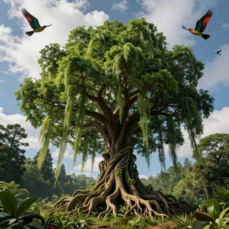 Surreal forest scene featuring a colossal tree with its roots sprawling upwards into the sky, adorned with cascading green tendrils, while its branches extend downward, cradling lush foliage against a backdrop of fluffy clouds and soaring birds with iridescent wings.
