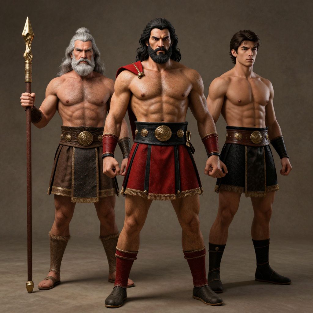 The image depicts a striking scene of three male warriors, each representing a different generation, set against a muted, earthy background. The central figure, a bearded man with a muscular build, stands prominently in the foreground, his body adorned with a red sash and a black belt. To his left, an older warrior with a gray beard and muscular arms holds a staff, while to his right, a younger warrior with dark hair and a muscular physique stands alert. The three figures are arranged in a triangular formation, creating a sense of balance and harmony. The older warrior's staff and the younger warrior's muscular build suggest a narrative of strength and lineage, with the central figure bridging the gap between the two generations. The interplay of light and shadow on their bodies highlights their physical prowess and the detailed textures of their skin and clothing. The overall composition, with its dynamic spatial relationships and rich color palette, evokes a sense of historical significance and familial pride.