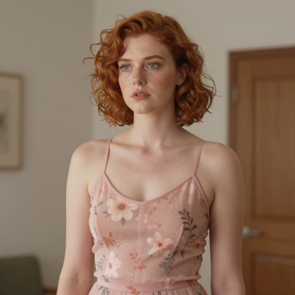 Blonde woman with curly hair in white dress with red "FEUD" stands in yellow room, hands on hips. Green plaid man's back faces her. Bed with blue blanket in background. Chair with floral cushion on left.