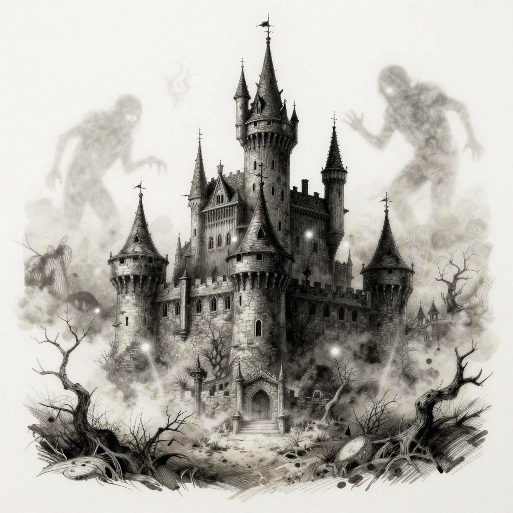 Spooky castle drawing showcasing a mysterious fortress surrounded by fog and barren landscape, haunted by spectral lights and shadowy silhouettes. The artwork uses a monochrome palette with intricate crosshatching and subtle color washes to convey gloom and suspense.