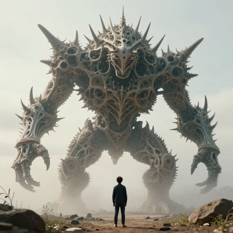 A young figure confronts a towering, spiky monstrosity composed of intricate, organic fractal patterns, its form defying gravity and logic as it looms over the serene landscape.