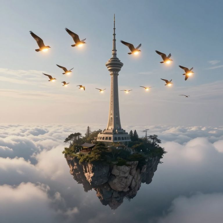 A luminous flock of birds, each bearing a radiant, glowing orb, soars in perfect formation over a serene, floating island crowned by a majestic tower, defying gravity amidst a sea of clouds.