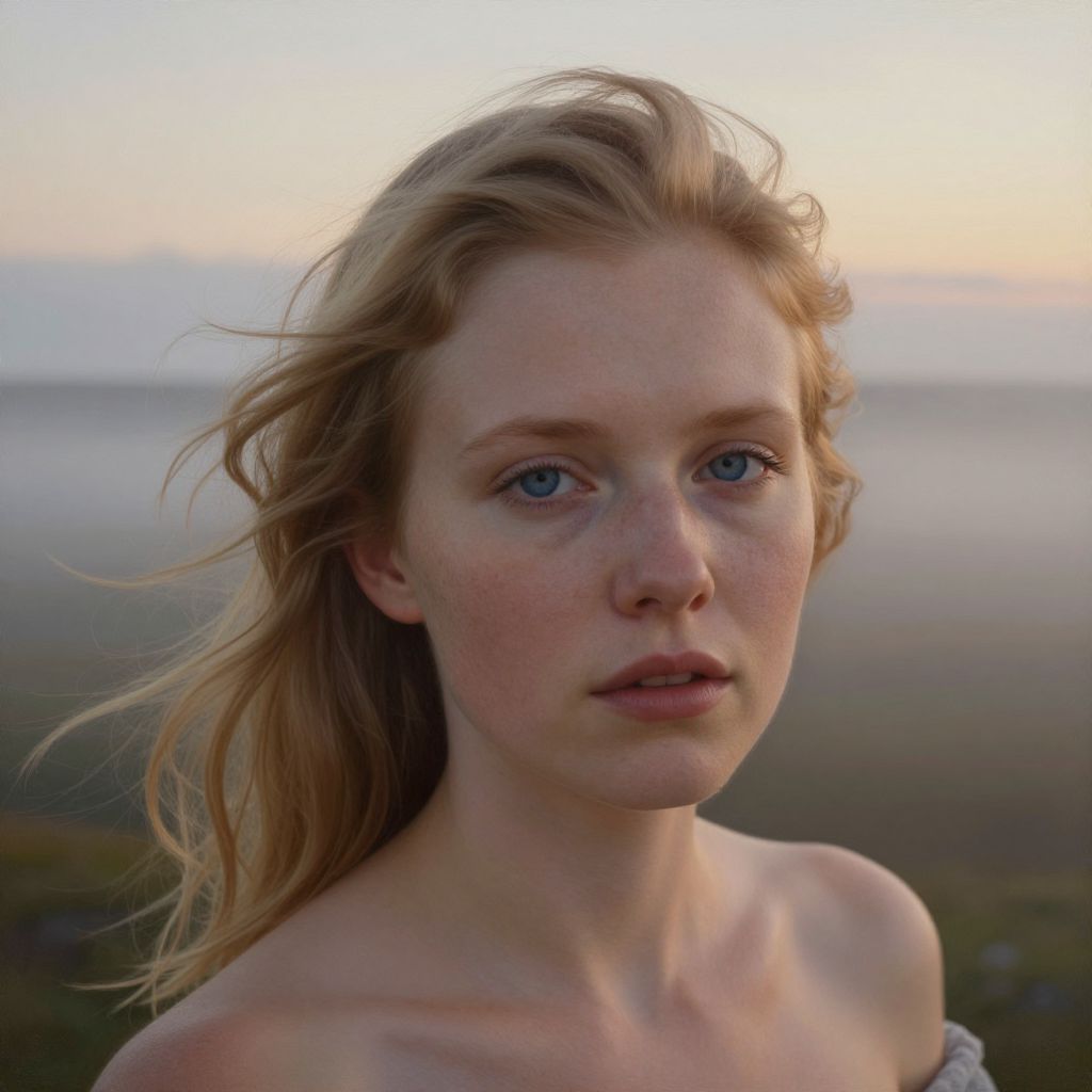 Imagine a captivating portrait photograph of a Nordic woman with piercing blue eyes and golden locks billowing in the breeze, captured from an unusual aerial angle that intimately showcases her serene features. The image seamlessly merges fine art oil painting techniques with modern digital precision, accentuating the intricate details of her porcelain skin, delicate freckles, and subtle emotions across her countenance. Standing amidst a vast misty landscape at dawn, soft morning light filters through wispy clouds, casting a warm glow on her face that highlights the texture of her skin while evoking an emotional spectrum ranging from contemplation to hope as a new day begins.