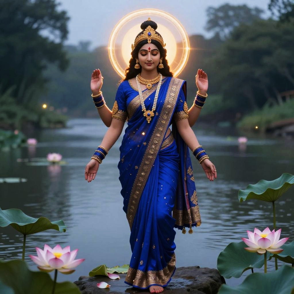 Sexy Hindu goddess poised beside a sacred river, wearing a deep blue saree with gold embroidery, her silhouette glowing with divine light, surrounded by floating lotus petals and fireflies, with a celestial halo framing her peaceful and seductive expression.