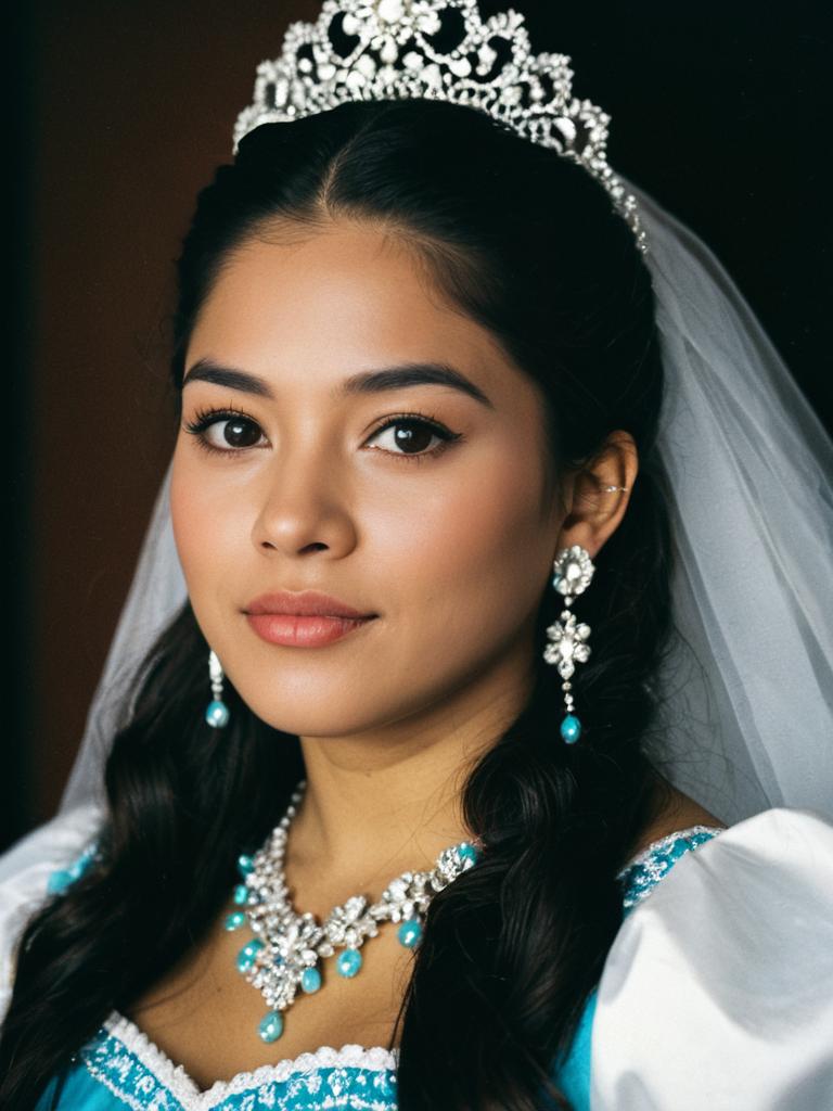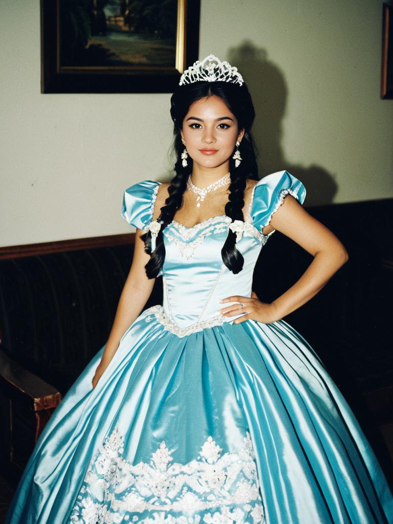 Woman in Quinceañera Dress costume, cosplay editorial photography, photorealistic tones