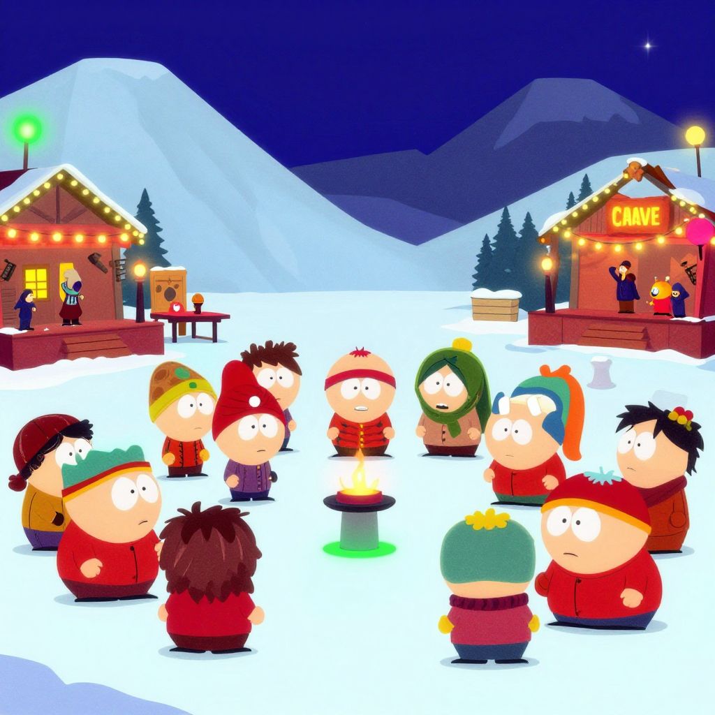Crave South Park winter festival scene, detailed cartoon characters enjoying festivities with snowy hills and vibrant lights, capturing the show’s unique art style and irreverent humor.