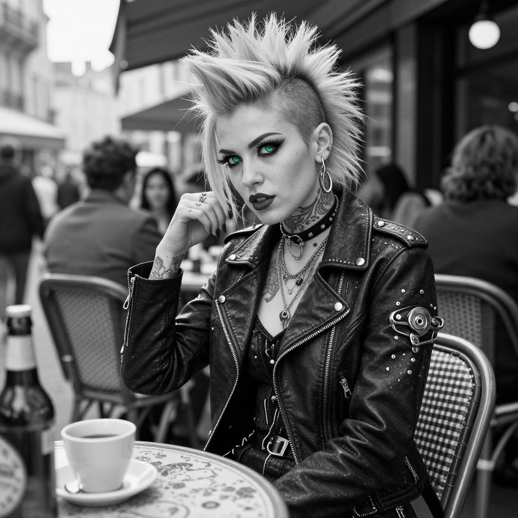 In this highly detailed and ultra-realistic black-and-white photograph, a striking punk woman with vibrant green eyes sits at a café terrace, exuding a sense of cool confidence. Her blonde hair, styled in a rebellious Mohawk, frames her face, which is adorned with intricate tattoos and bold makeup. She wears a leather jacket with metallic accents and a necklace, adding to her edgy appearance. The setting is reminiscent of the 1900s, with a rustic table and chairs, a bottle, and a cup on the table, suggesting a casual, relaxed atmosphere. The background, though blurred, hints at a bustling urban environment, with buildings and other patrons visible, creating a dynamic and lively scene. The photograph captures the essence of a cyberpunk aesthetic, blending historical elements with futuristic touches, all rendered with meticulous attention to detail.
