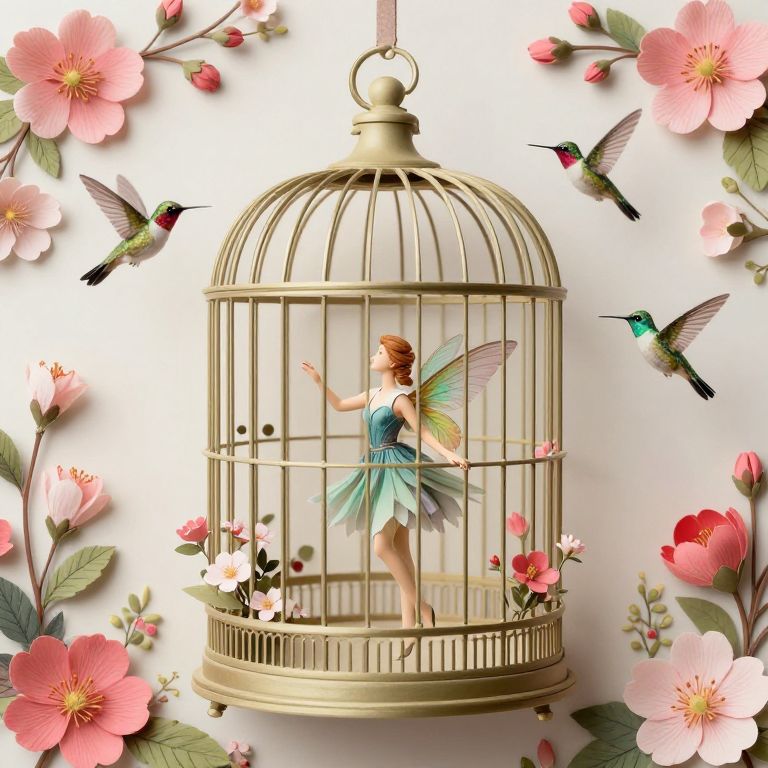 Enchanted serenity whispers through a delicate paper world where a fairy, trapped within a birdcage, yearns for freedom amidst a vibrant tapestry of blossoms and fluttering hummingbirds, symbolizing the eternal dance between captivity and liberation.