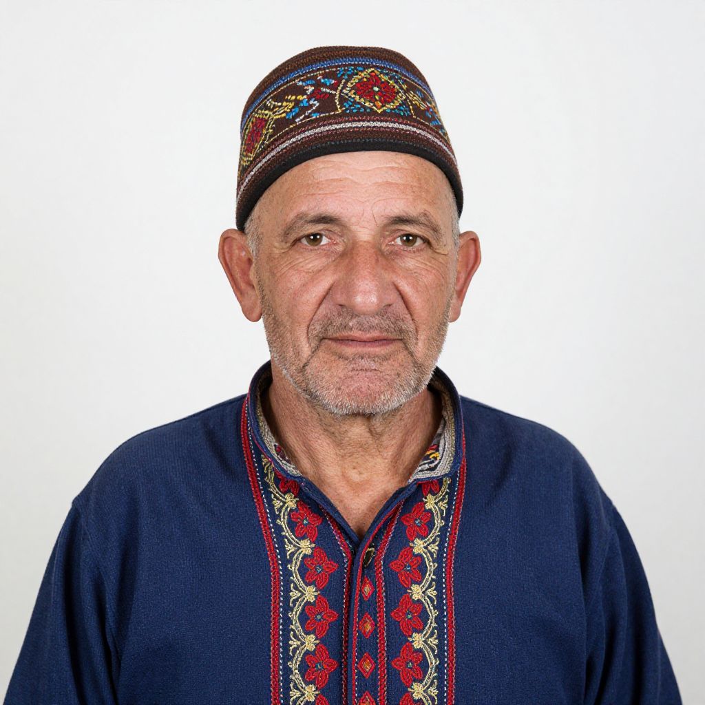 Photograph of an older man with a weathered face and short gray beard. He's wearing a colorful, patterned brown hat and a deep blue shirt with intricate red and gold embroidery down the front. The background is plain white, making him the focal point. His expression is calm and slightly serious. The textures of his clothing and hat are detailed and vibrant.