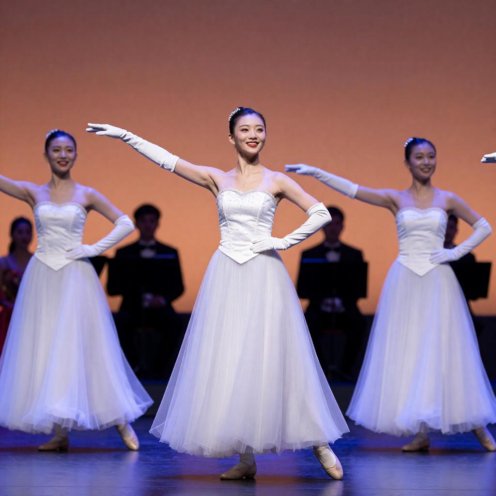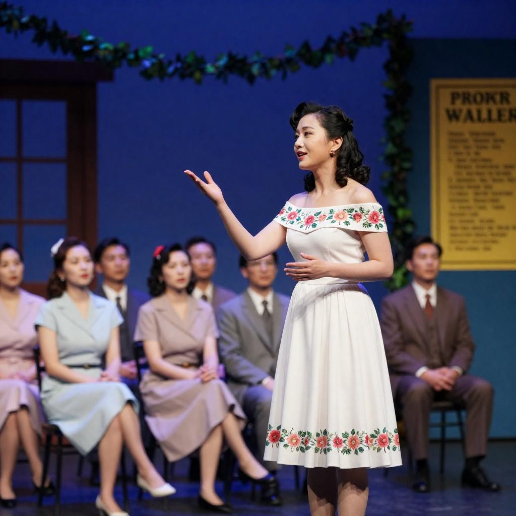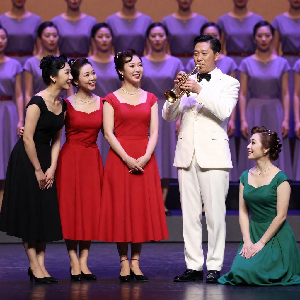 Photograph of a musical stage. Front left: two women in black and red dresses, smiling, leaning close. Center: woman in red gown holding hands with man in white suit playing trumpet. Right: woman in green gown kneeling. Background: chorus line in purple dresses. Bright colors, mid-century style.