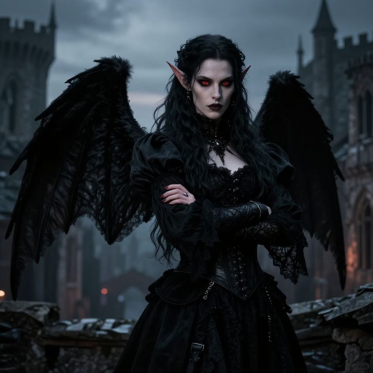 A digital illustration of a dark elf woman with pale skin and long, wavy black hair, standing in a gothic, medieval city. She has pointed ears, glowing red eyes, and large, black, feathery wings. She wears a black, Victorian-style dress with intricate lace and leather accents, and her arms are crossed. The background features an overcast sky and stone castle towers, with a cobblestone street and dim, ambient lighting. The overall mood is dark and mysterious, with a focus on gothic and fantasy elements.
