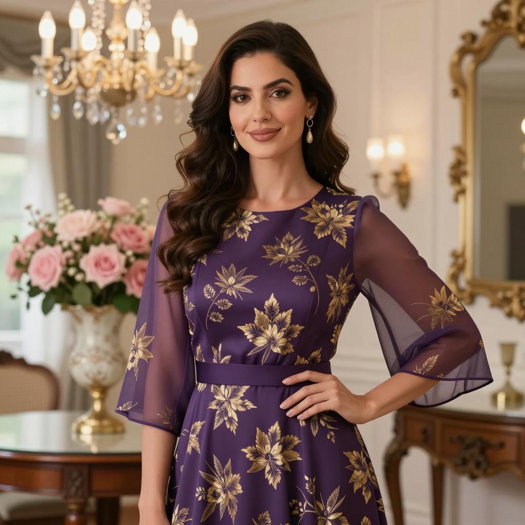 Party wear dress frock, photograph of a beautiful woman, medium skin tone, long wavy dark brown hair, wearing a sleeveless purple dress with gold floral patterns, sheer bell sleeves, standing in an elegant room, background with chandeliers, pink bouquets of flowers, wooden furniture, soft natural light, warm colors, smile, subtle makeup, elegant and sophisticated atmosphere, portrait orientation