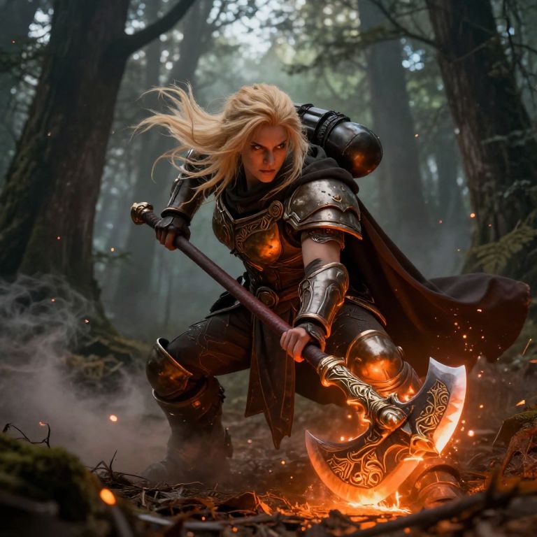 A fierce female SpaceW40K warrior crouched low, gripping a long, ornate axe with both hands, illuminated by a fiery orange aura that highlights intricate golden designs on the blade and hilt; rugged expression, blonde hair flowing freely, clad in power armor with a dark cloak draping over her back; misty twilight forest background with dark looming trees, smoky ethereal air, glowing embers and sparks around; earthy browns, oranges, and golds dominate the scene, contrasting with cooler dark greens and grays of the forest, creating a mystical, intense atmosphere