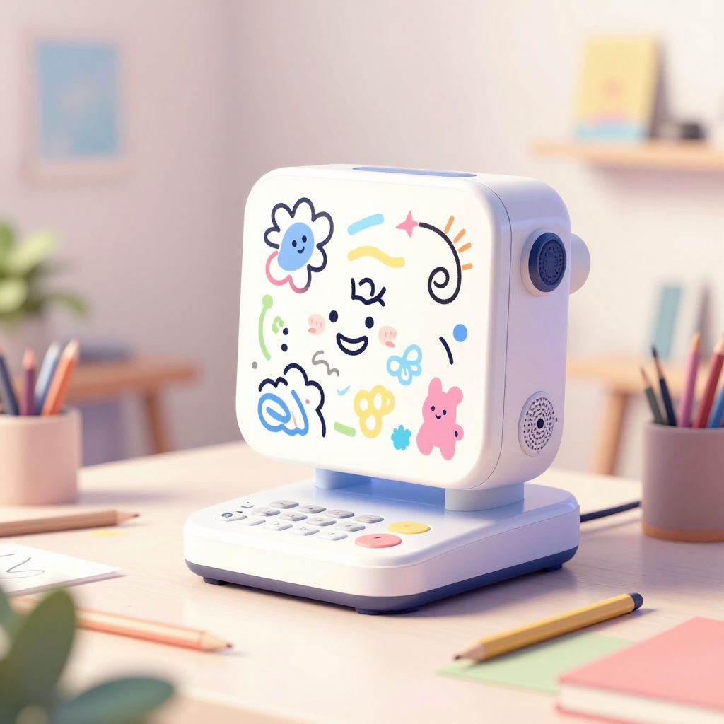 Doodle AI machine in a cozy artist studio, drawing abstract shapes and cartoon characters, bright pastel colors, soft brush strokes, futuristic yet handmade feel, digital illustration capturing innovation and imagination