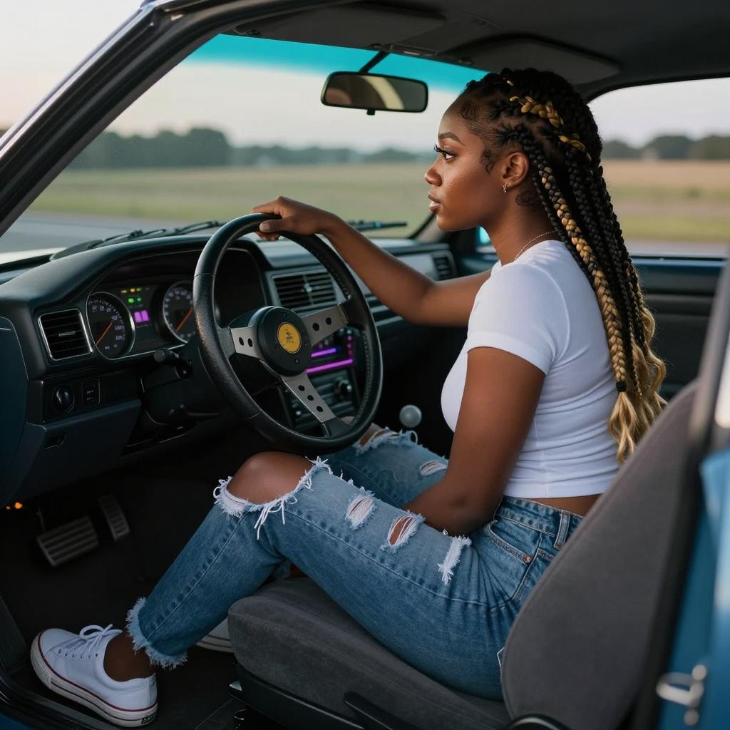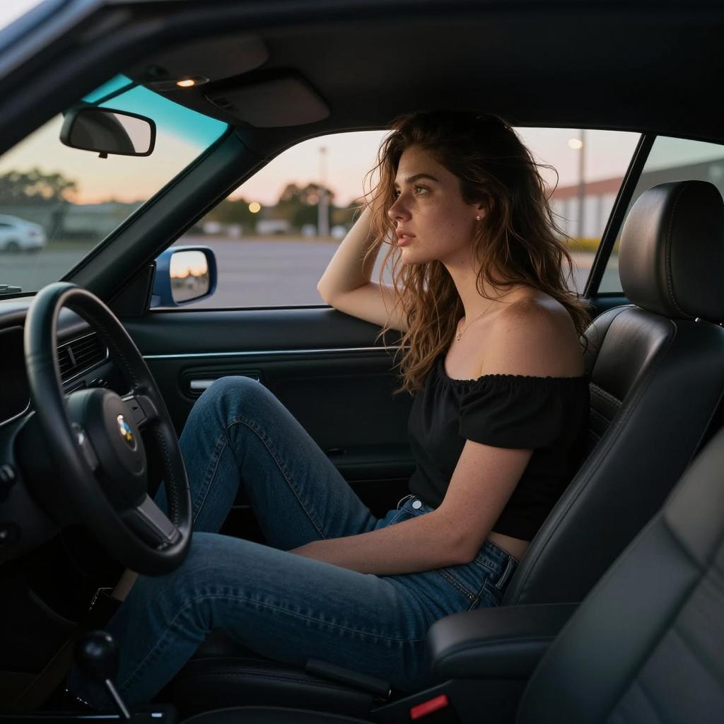 Young woman with shoulder-length wavy hair and minimal makeup seated in the driver's seat of an older sports coupe with dark leather interior. She is wearing a long-sleeve crop top and leather-look leggings, leaning forward on the steering wheel with a contemplative gaze out the windshield. The scene is set during sunset on the outskirts of a city, capturing warm orange light streaming through the windshield and creating a cinematic atmosphere with shallow depth of field.