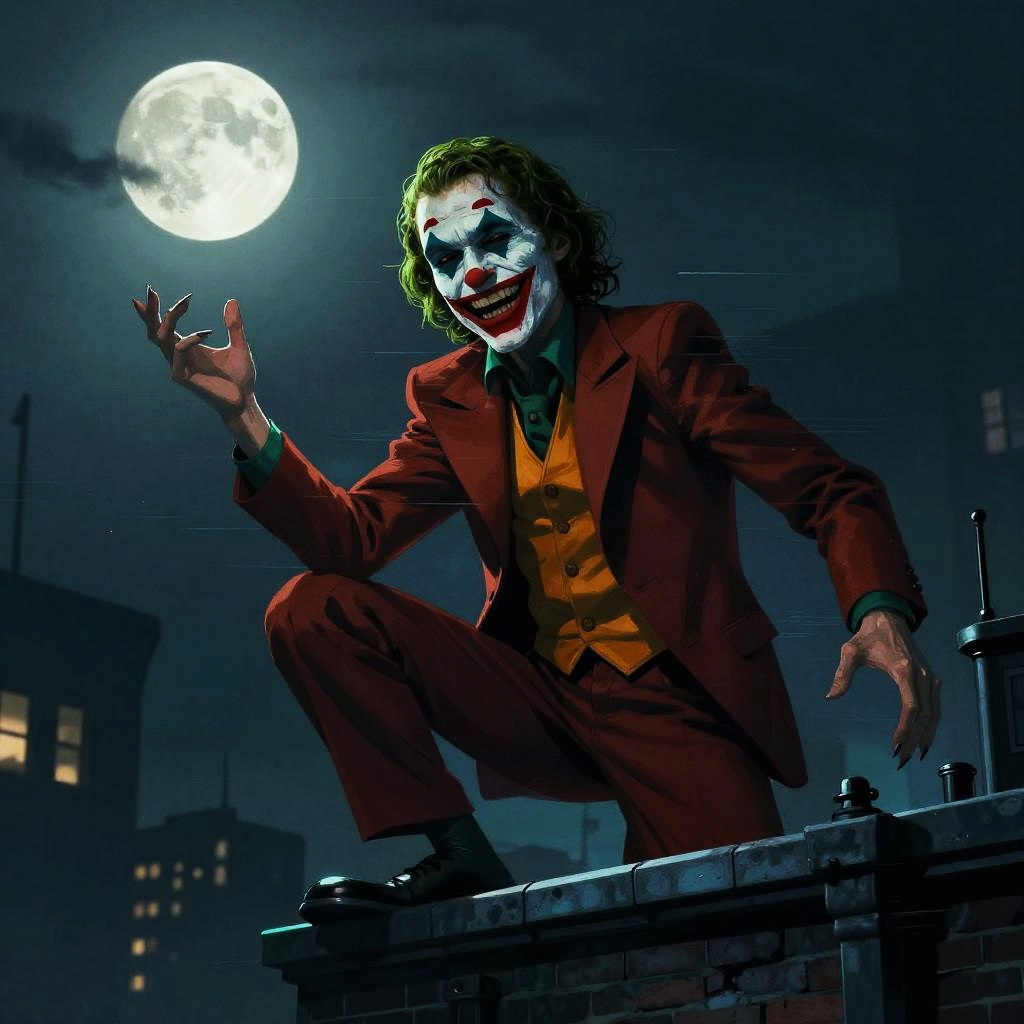 Digital artwork of Joker in red suit, yellow vest, white face paint, and red lipstick, crouching on rooftop under full moon.