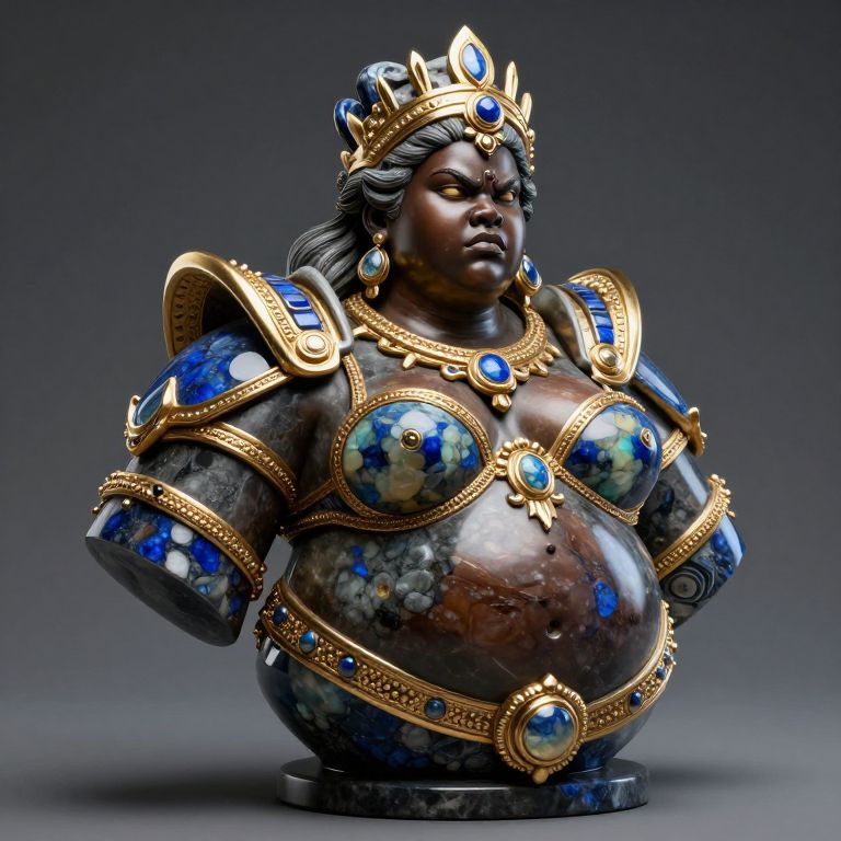 Photograph of a detailed, sculpted bust of a regal, dark-skinned female figure with an ample belly. She wears an ornate golden crown adorned with blue gems, matching shoulder armor, and a decorative chest plate. Her breasts are partially covered by blue and gold circular designs. The sculpted figure has long, wavy black hair and a serious expression. The background is a simple, gradient gray, highlighting the intricate blue, gold, and marble-like textures of the sculpture. The bust is placed on a small, dark circular base.