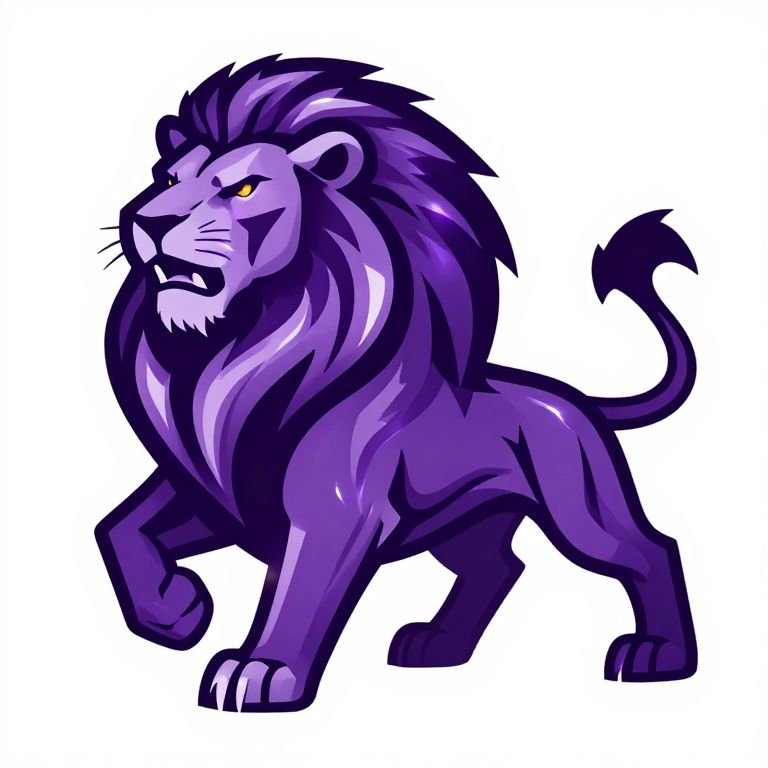 Purple lion logo, tribal inspired lion design with intricate line work, intense purple and violet shades with slight glow effects, dynamic pose exuding power and strength, ideal for sports team emblems