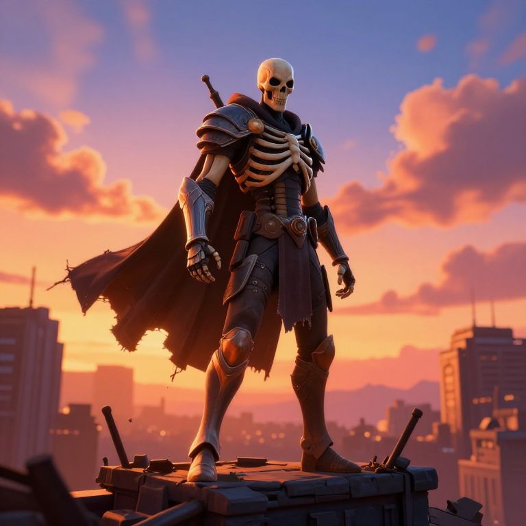 Epic Fortnite skeleton skin standing on a ruined city rooftop during sunset, tattered cloak flowing, detailed bone armor with glowing orange highlights, atmospheric clouds, cinematic wide angle, vibrant color grading, digital painting quality.
