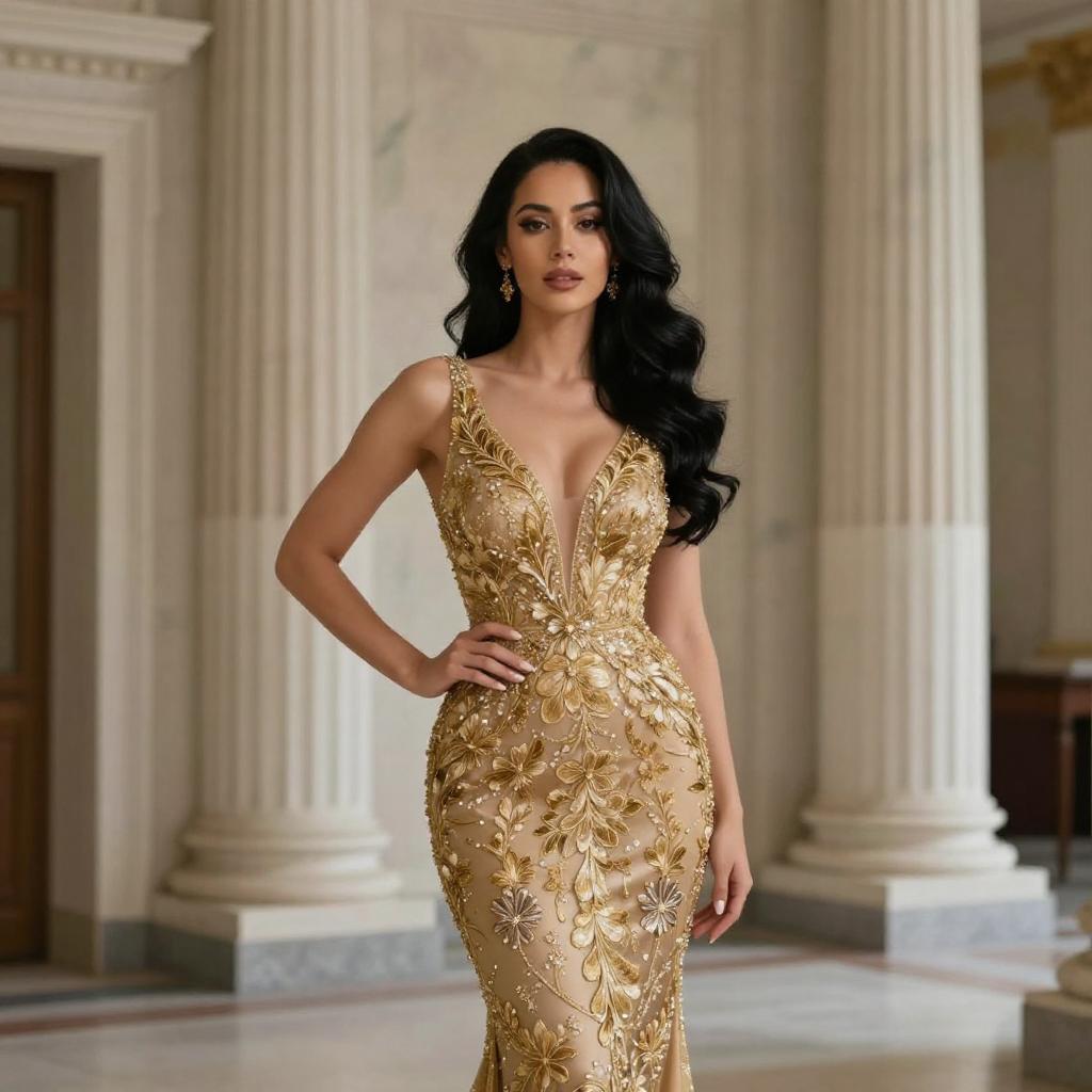 Photograph of a woman with long, wavy black hair wearing a gold, deep V-neck, form-fitting gown with intricate floral embroidery. She stands in a grand, classical-style room with tall white columns and marble walls. Her right hand rests on her hip, and she gazes confidently forward.