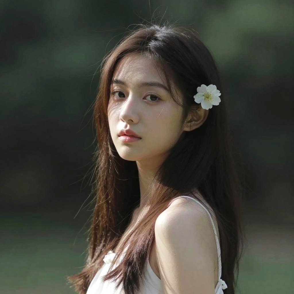 Photograph of an Asian woman with long black hair, wearing a white floral hairpin and sleeveless white top, standing outdoors with a blurred green background