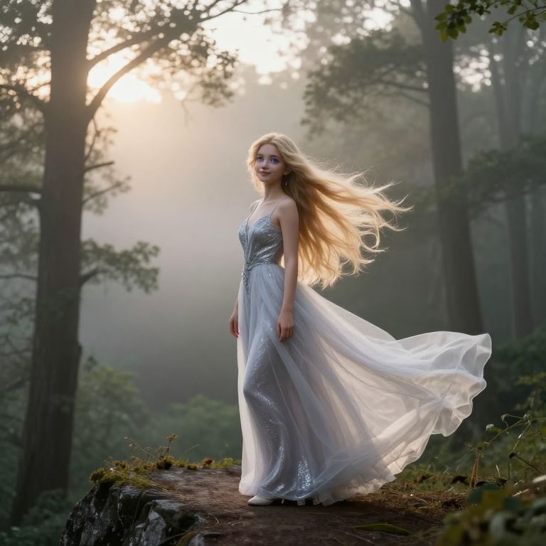 A fairy in a long, flowing dress made of sheer silver and white tulle stands on a cliff overlooking a misty forest at dawn. Her long blonde hair floats in the morning breeze, and she has large, expressive blue eyes with a gentle smile. The setting is peaceful and otherworldly, with soft fog curling around trees and sunlight breaking through the canopy.