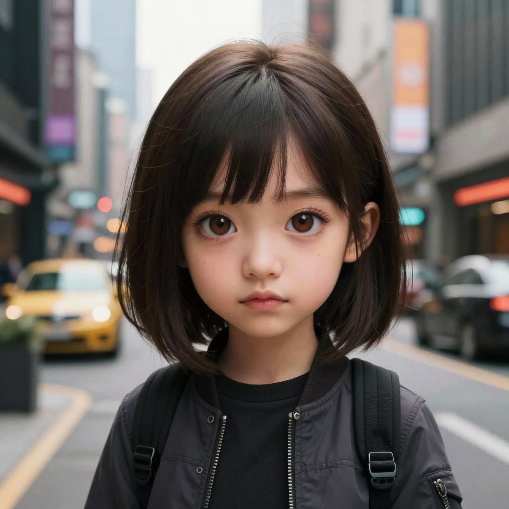 Digital anime-style portrait of a young Asian girl with large brown eyes, black bob haircut, wearing a black jacket, standing in a blurred urban street with