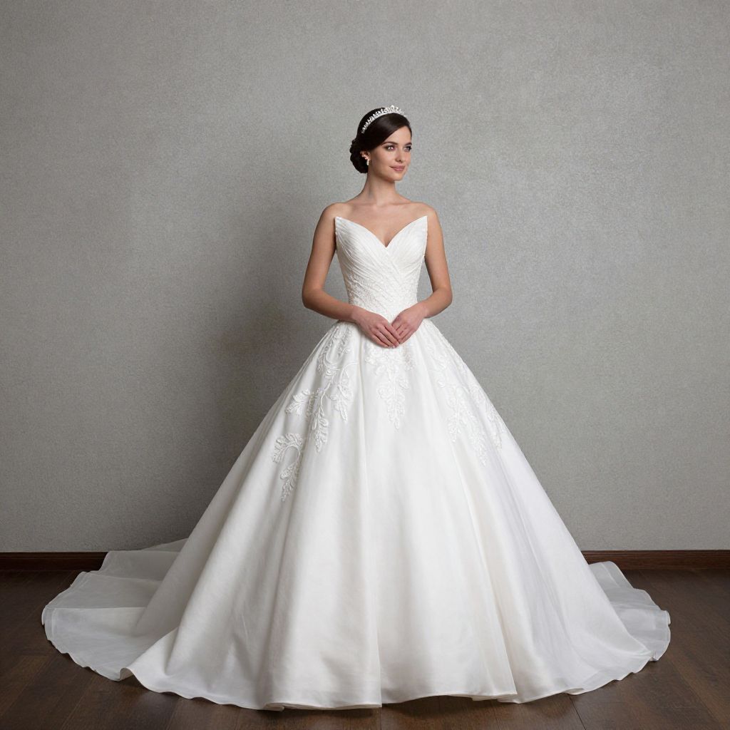 "Swan Princess Wedding Dress, a woman in a wedding dress standing in front of a wall"