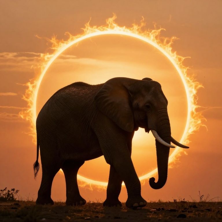 A majestic elephant strides gracefully against a surreal sunset backdrop, its silhouette framed by a fiery annular eclipse that casts a radiant halo of golden light, evoking a dreamlike, high-definition digital art composition.