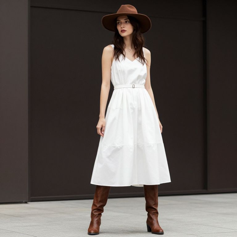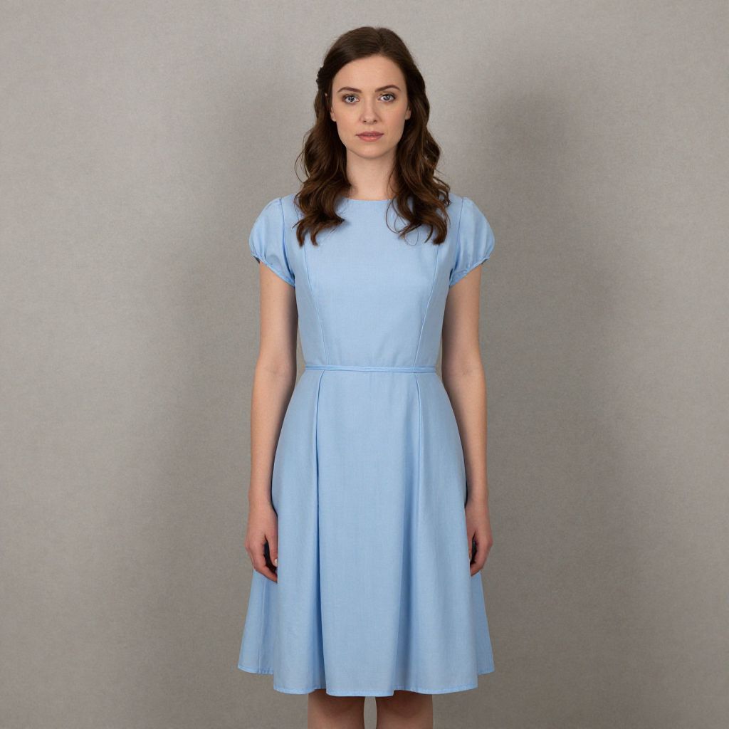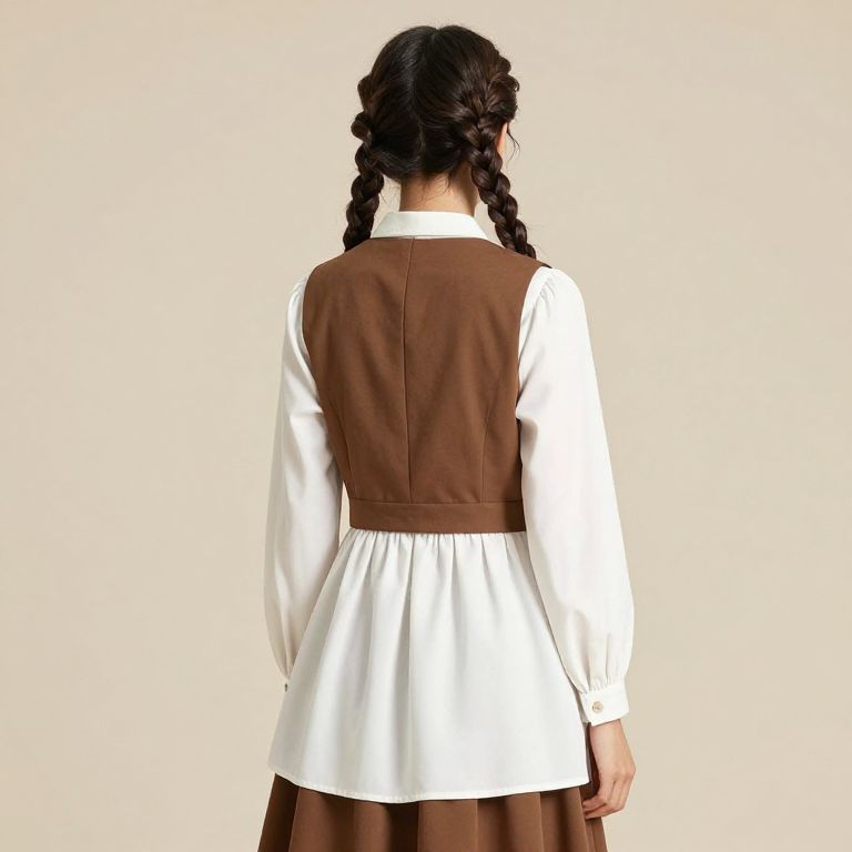 Photograph of a young woman with fair skin and wavy brown hair, standing against a plain gray background. She wears a white short-sleeved blouse with a square collar, topped by a dark blue pinafore dress that reaches mid-calf, over a white, pleated, knee-length skirt. She holds a brown leather clutch in front of her. Her footwear consists of black knee-high socks and dark brown, lace-up shoes. She stands with a neutral expression, arms relaxed at her sides, and her posture is straight and composed. The lighting is even, highlighting the simplicity and modesty of her attire.