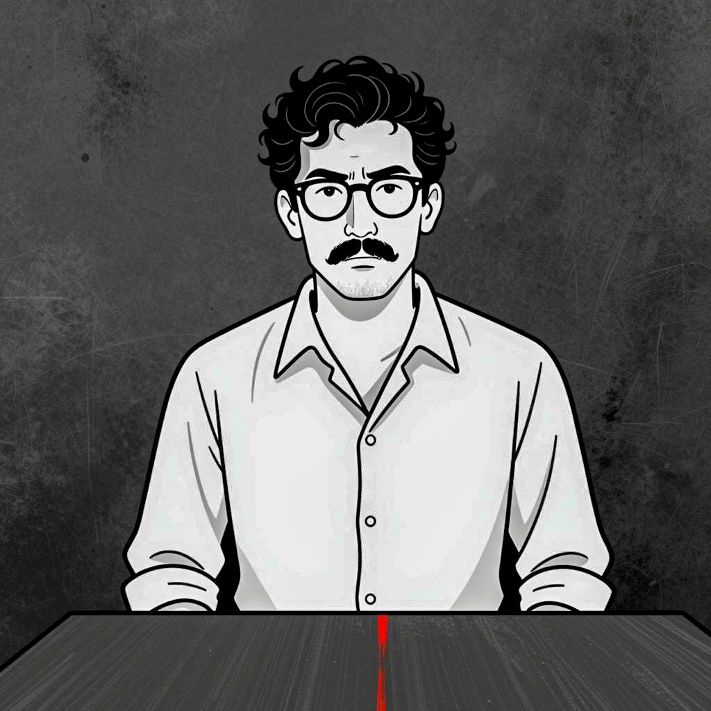 Black and white illustration of a man with curly hair, glasses, and a mustache. He wears an open-collared shirt, standing behind a dark, ured table with a red streak running down the center. Background is a rough, ured wall. Man's face is stern, head slightly tilted.