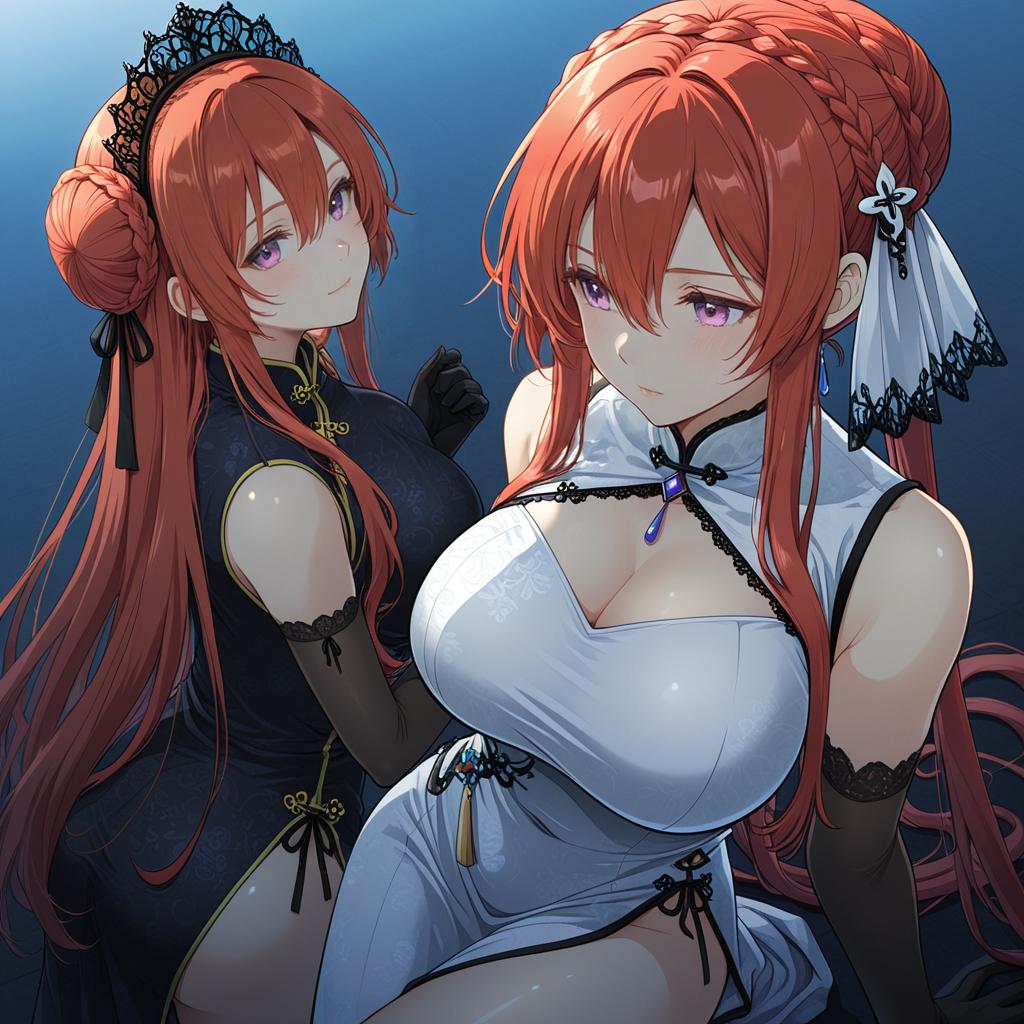 Digital anime-style illustration featuring two red-haired women with purple eyes. The woman on the left wears a black cheongsam with black lace arm sleeves and a black lace headpiece. The woman on the right wears a white cheongsam with black lace trim, revealing ample cleavage. Both have long red hair styled in intricate braids and side buns, with white floral hair accessories. The background is a gradient of dark to light blue. The expressions are serious and slightly alluring, with a focus on their large breasts and elegant attire. The image has a glossy, high-contrast finish.