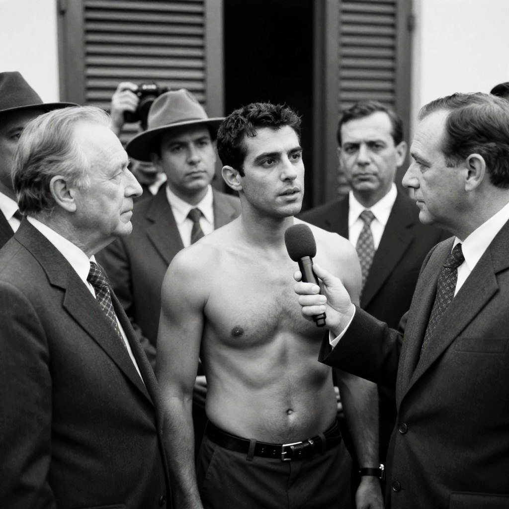 Black-and-white photograph of a shirtless man with short dark hair being interviewed by an older man in a suit and tie. Group of men in suits and hats surrounds them, some holding cameras. The shirtless man stands in the center, looking up at the interviewer. Intense expressions on some faces. Background includes wooden shutters.