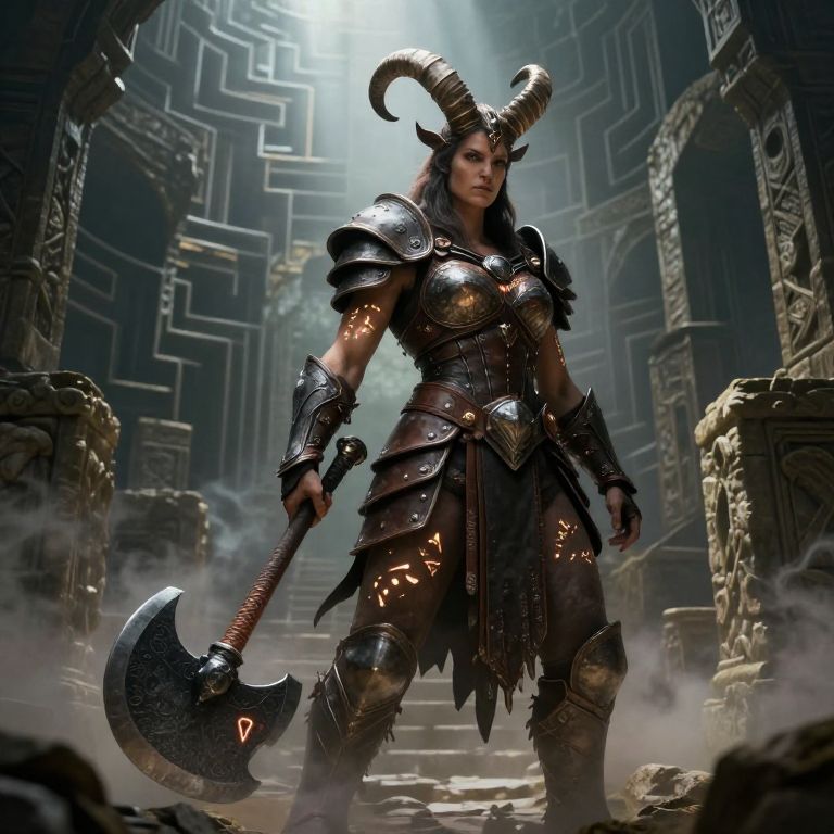 Female minotaur dnd character standing in an ancient labyrinth, muscular and fierce, armored in intricate leather and iron, holding a massive battle axe, glowing runes etched on her skin, mist swirling around, fantasy art style, dramatic lighting