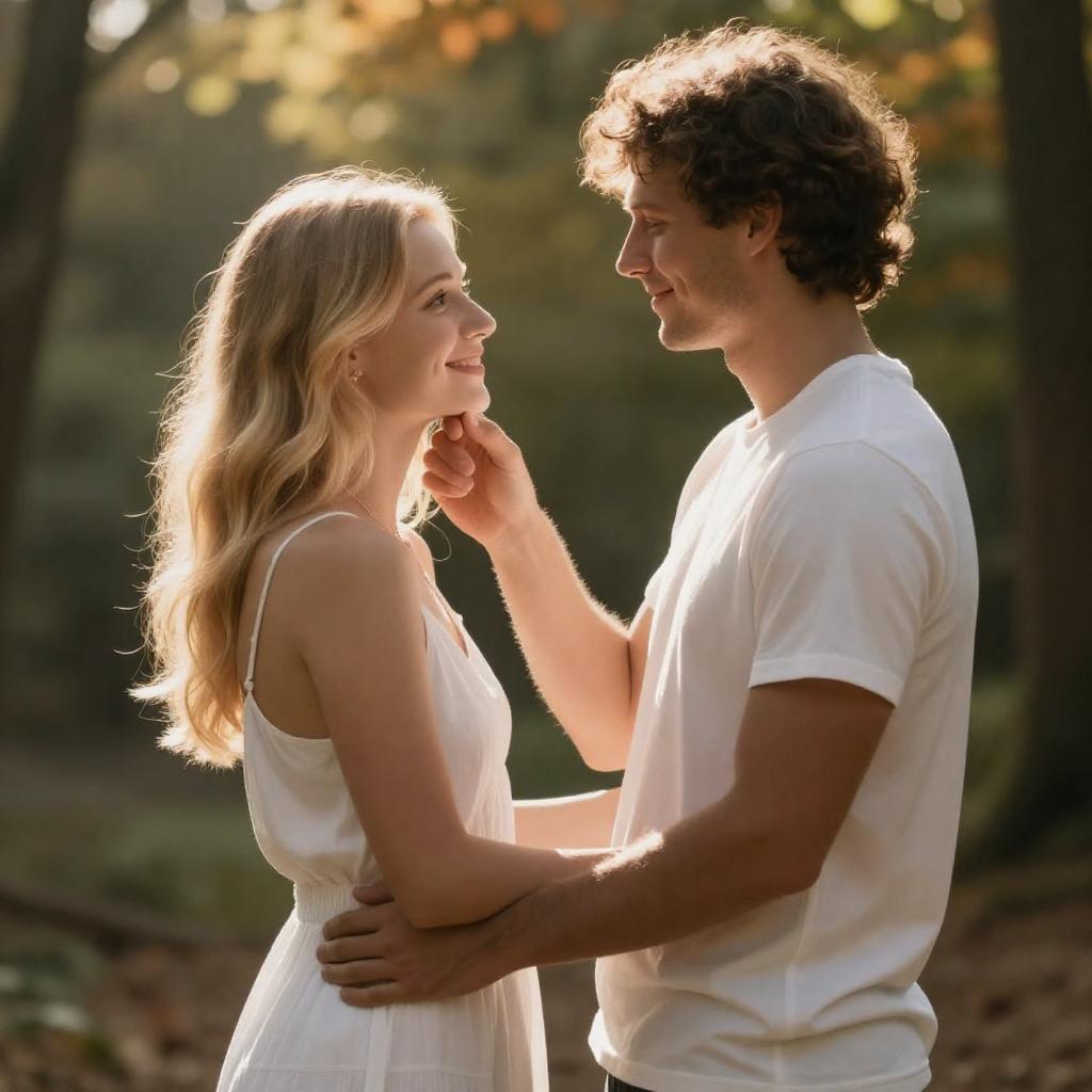 Photograph of a couple in an intimate embrace. Man with short brown hair, wearing a white knitted sweater, faces woman with long blonde hair, wearing a black top. Both have closed eyes, smiling. Christmas tree with colorful lights in background. Woman's arms wrapped around man's neck. Warm, soft lighting.