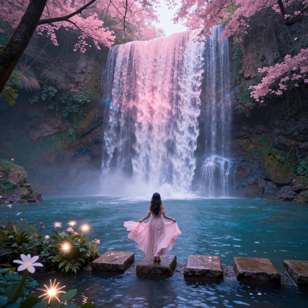 A mystical waterfall illuminated by soft pink and blue lights cascading into a tranquil pool. In the foreground, a woman in a flowing dress stands on stone steps, surrounded by glowing flowers and lush foliage under a canopy of pink-hued trees. The scene evokes a magical, fantasy atmosphere.