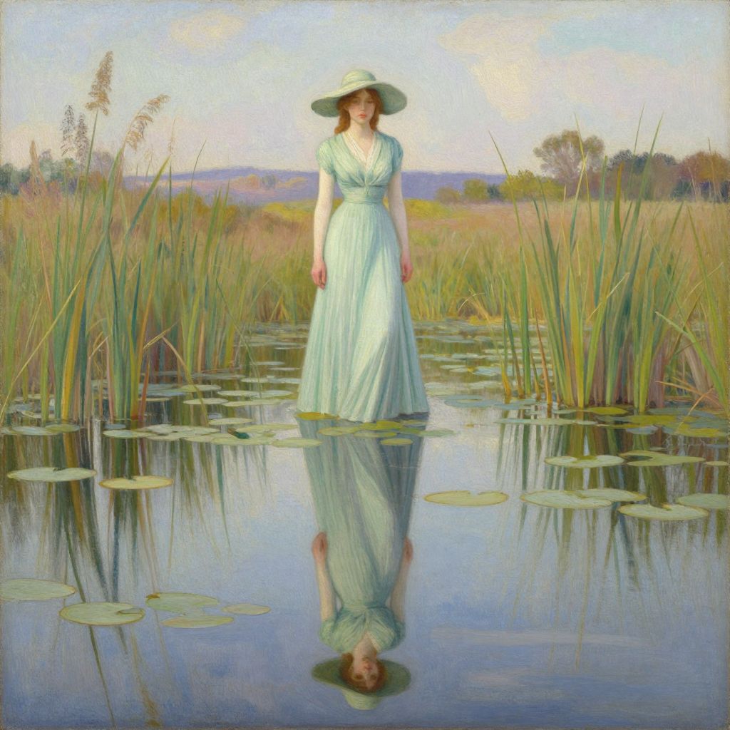 The image depicts a woman standing in a serene swamp, rendered in an Alphonse Osbert-style oil painting with pastel colors. She is dressed in a flowing, light green dress and a matching wide-brimmed hat, her figure reflected in the calm water. The swamp is filled with tall reeds and floating lily pads, creating a tranquil and somewhat mysterious atmosphere. The background features a distant landscape with trees and a soft, hazy sky, adding depth to the scene. The overall composition is balanced, with the woman positioned centrally, her reflection creating a symmetrical effect on the water's surface. The interplay of colors, textures, and shapes contributes to a harmonious and picturesque representation of this tranquil natural setting.