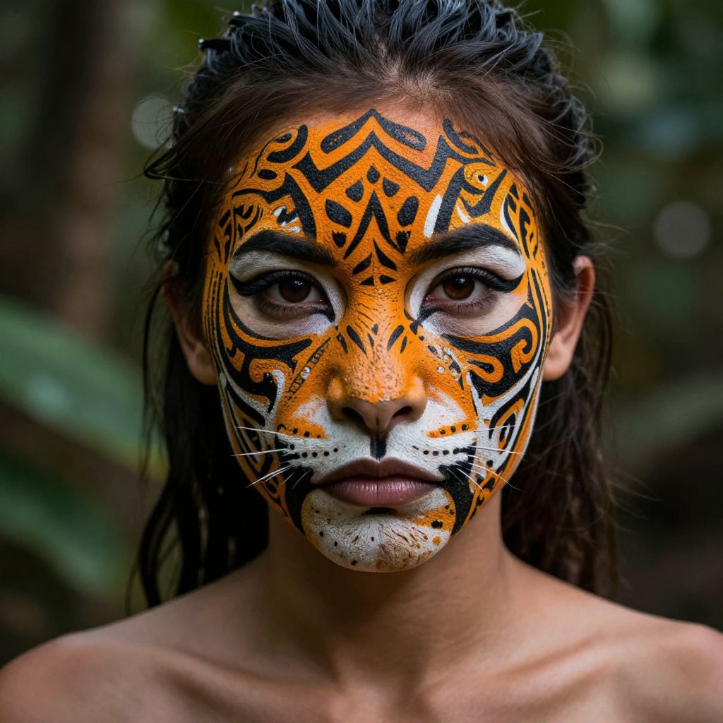 Jaguar face paint on a young woman, intricate tribal patterns blending with vivid orange, black, and white hues, realistic details with a fierce and wild expression, cinematic lighting highlighting texture, jungle background softly blurred