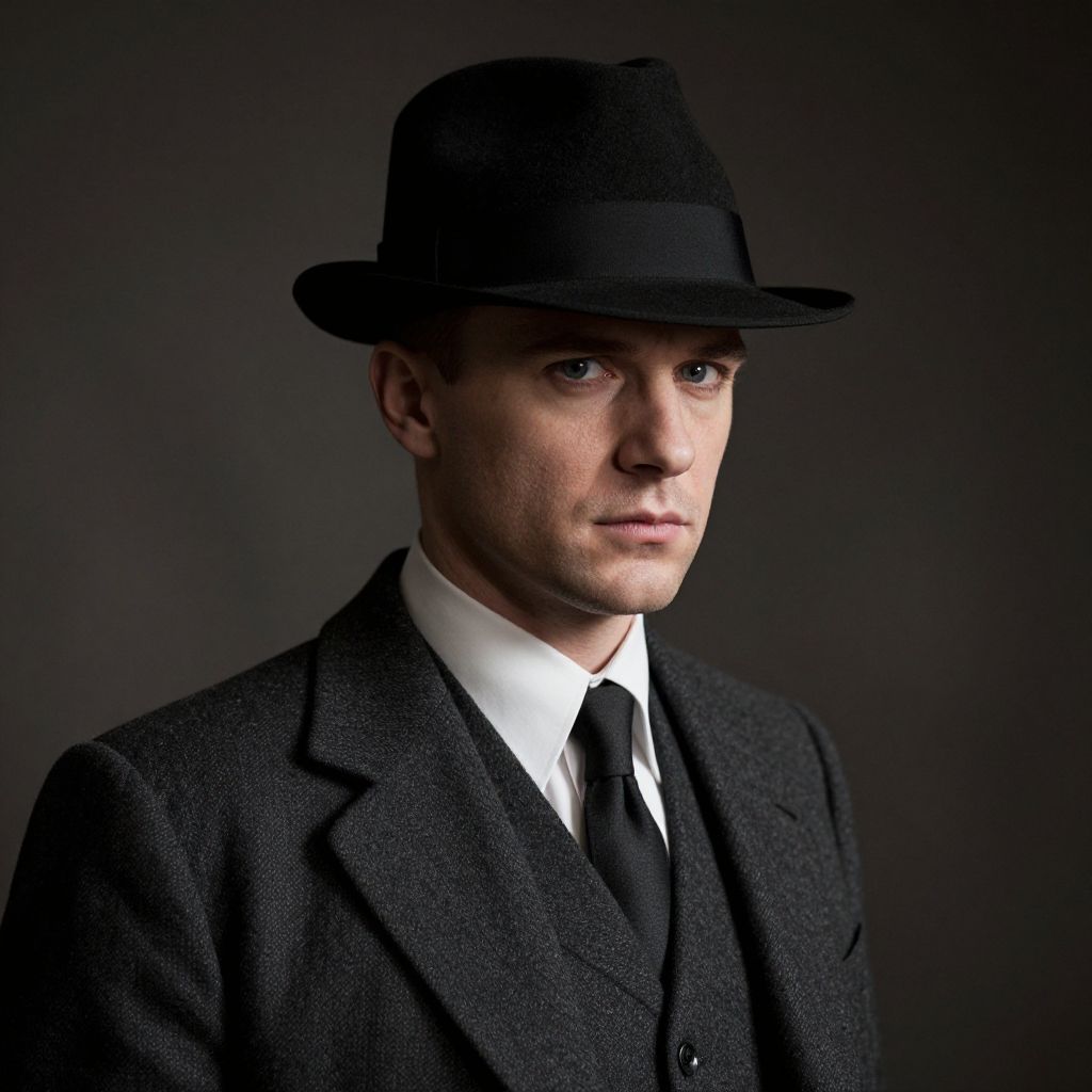 Photograph of a white man with a serious expression, wearing a black fedora, black three-piece suit, white shirt, and black tie. His light brown hair is visible under the hat. The background is dark and blurred, emphasizing the subject. The lighting creates a shadow across his face, highlighting his sharp features and blue eyes. The texture of the suit is slightly rough, contrasting with the smoothness of his shirt and tie. The overall style is reminiscent of a classic noir or detective character.