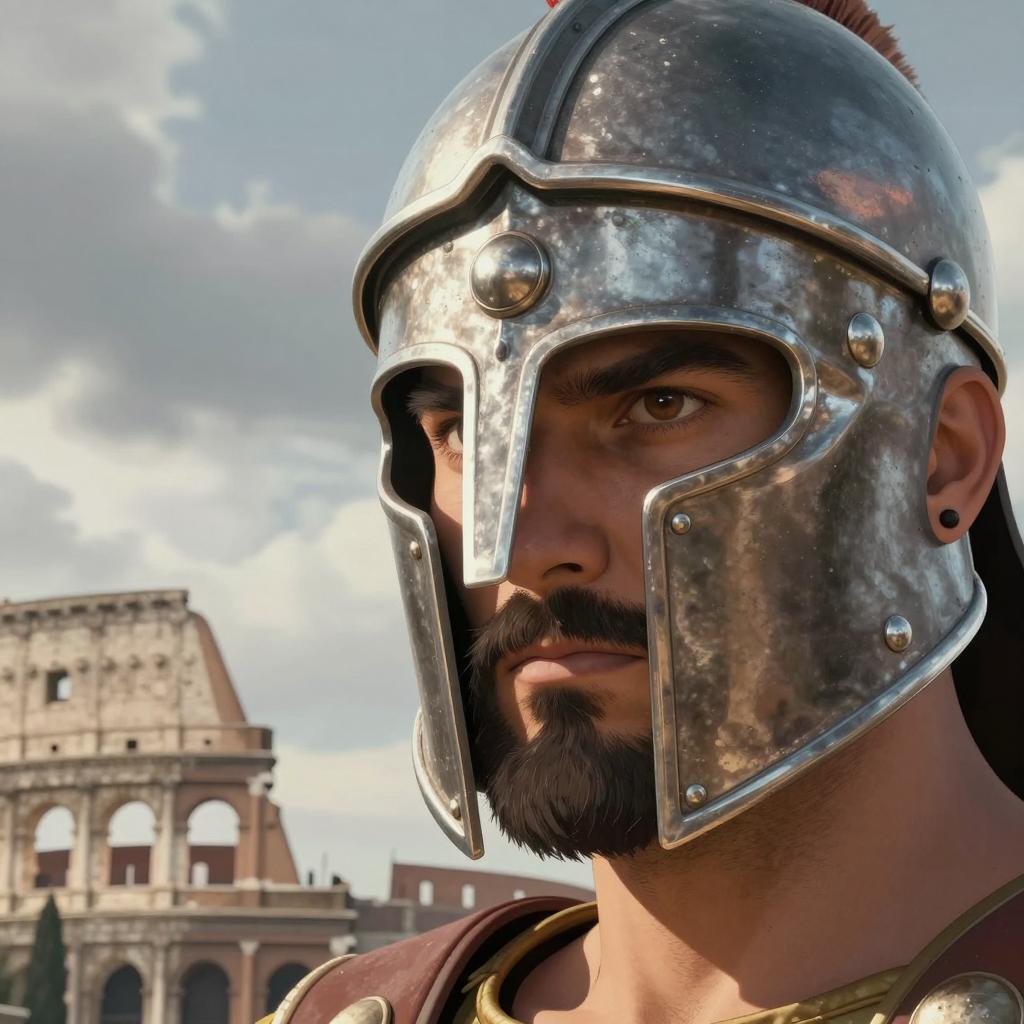 Close-up of a bearded man with intense gaze, wearing a silver metal helmet covering his nose and eyes, right side of face visible. Background: cloudy sky, ancient stone Colosseum with rows of flags. Visual style: digital illustration. Man's brown skin contrasts with silver helmet. Helmet's metal ure shiny, detailed. Colosseum gray, weathered. Clouds light gray, scattered debris in sky. Man's left ear visible, black earring.