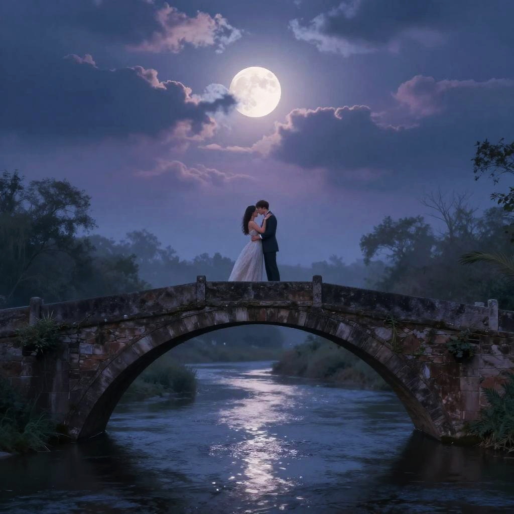 Photograph of a couple kissing on a stone bridge at night under a full moon, with a reflective river below and trees in the background.