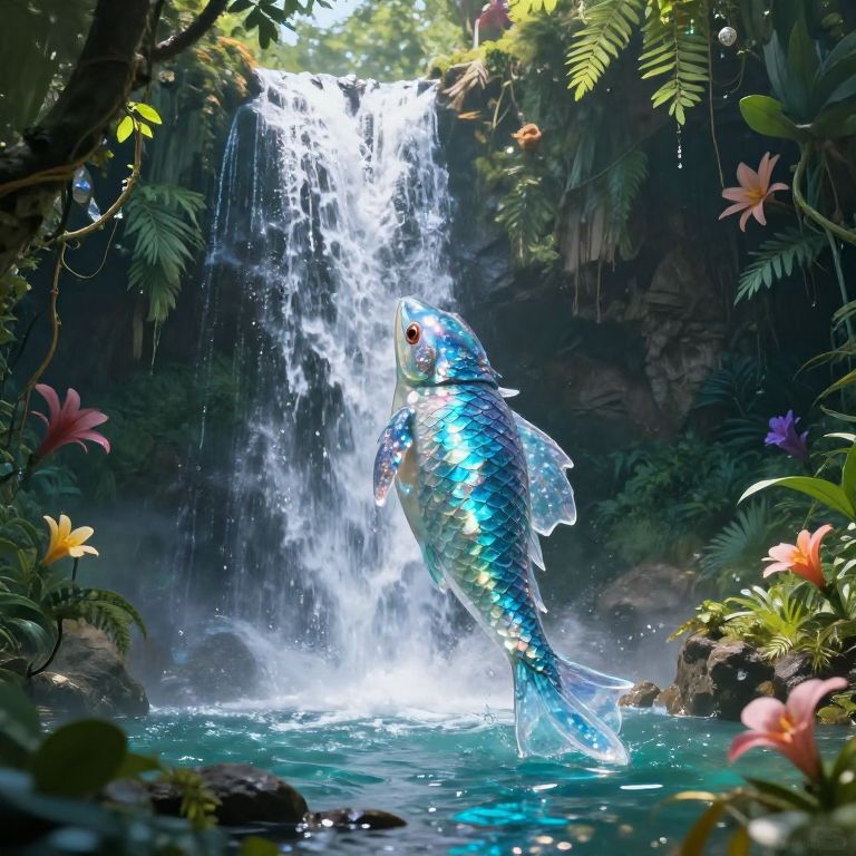 Tyuzu, a mythical water spirit emerging from a crystal-clear waterfall, shimmering scales sparkling under sunlight, lush jungle environment with exotic flowers and vines, high detail fantasy illustration with a serene and magical mood.