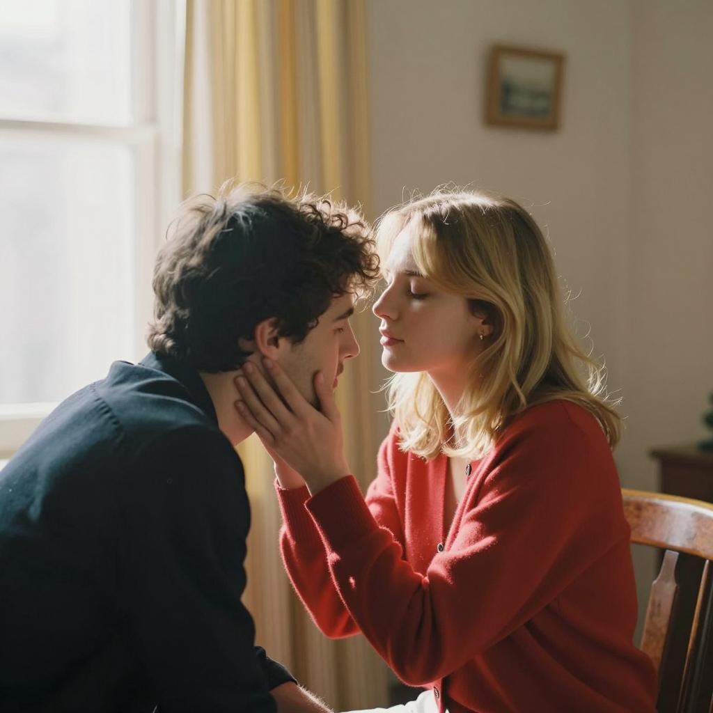 Two people in an intimate moment. Man with dark hair, black shirt, leaning forward. Woman with blonde hair, red cardigan, gently holding his face with both hands, eyes closed. Yellow-striped curtains in background. Wooden chair with curved backrest on the right. Sunlight through window.