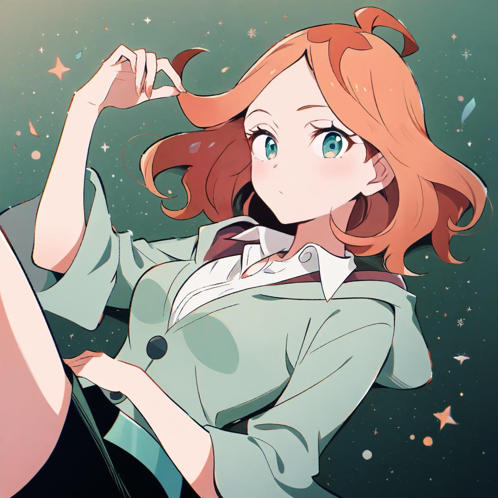 Amanda o'neill, little witch academia, 1girl, green eyes, short hair, orange hair, two-tone hair, red hair, ahoge, medium breasts, by artist mozukuzu (manukedori), animagine