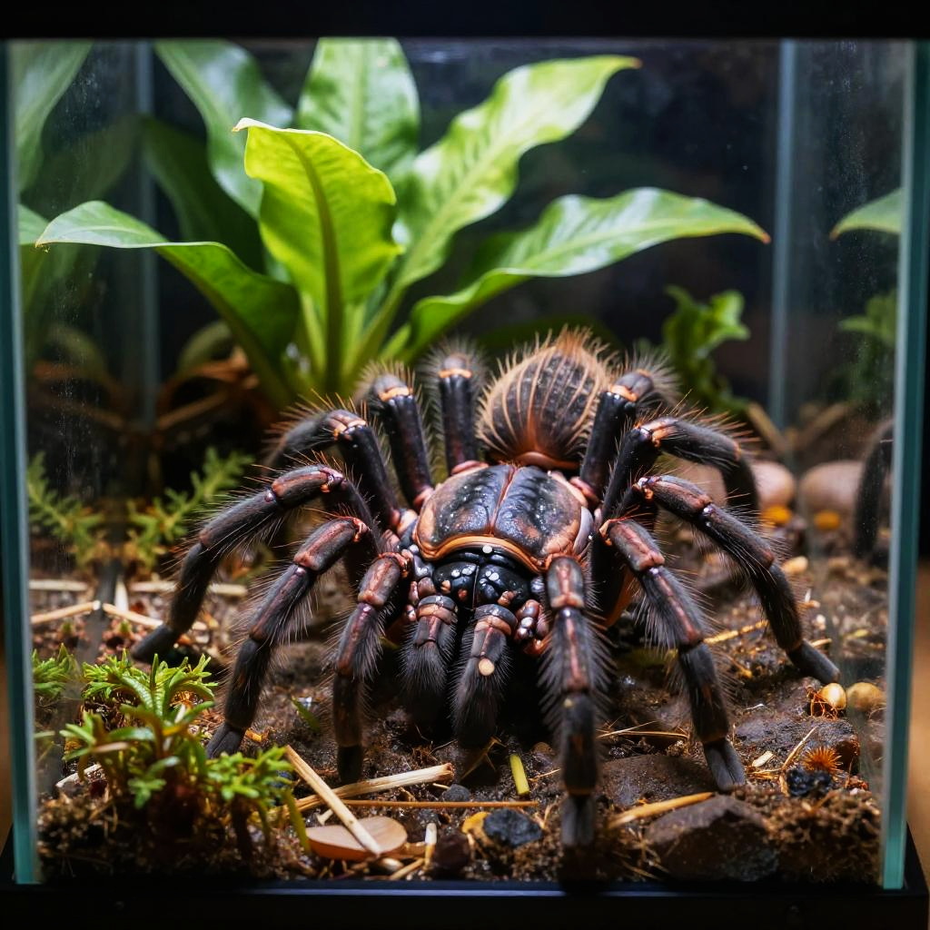 Photograph of a large, black tarantula with orange and white markings, and spiky hairs on its body and legs, situated in a glass terrarium. The tarantula is centered, facing forward, with its eight legs splayed out. The background includes green, glossy leaves and a dark, soil-covered substrate with small plants and twigs. The terrarium has a black, shadowy backdrop, highlighting the vibrant colors and textures of the tarantula and plants. The image is sharply focused on the tarantula, with a slightly blurred background, emphasizing depth.