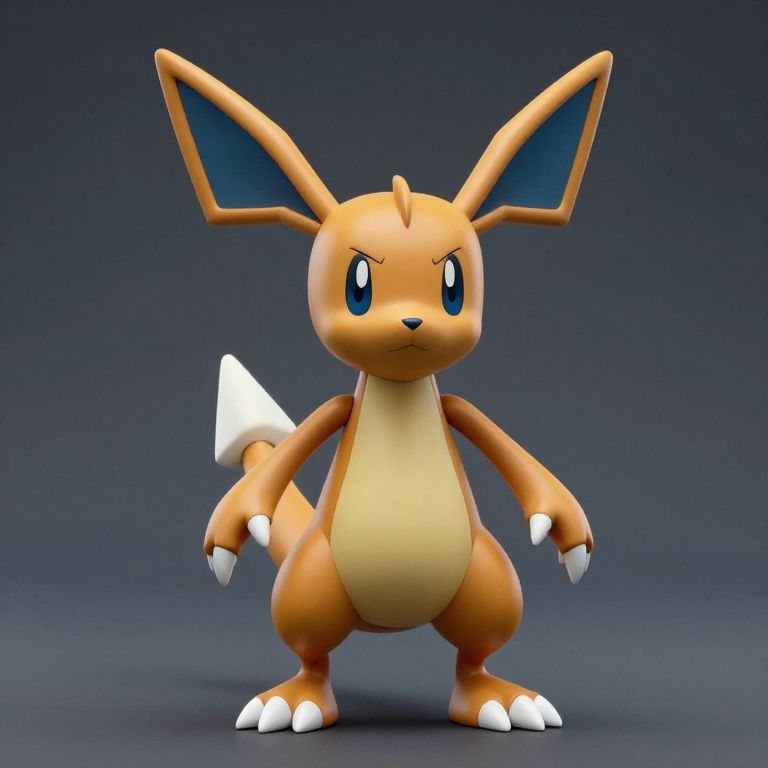 3D CGI of a determined-looking, orange, bipedal creature with large blue ears, white chest, and tail, standing against a dark gradient